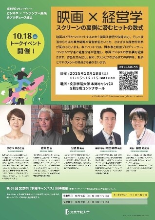 文京学院大学(学長:福井勉)は、経営学部にて『ビジネス×コンテンツ=未来をプロデュースせよ』と題したトークイベントシリーズの第二弾として、「映画×経営学:スクリーンの裏側に潜むヒットの数式」を2025年10月18日(土)に開催することをお知らせします。