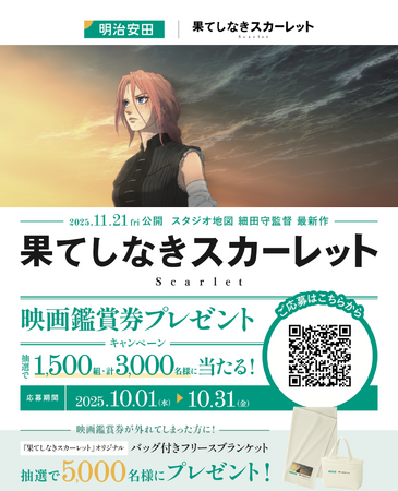 明治安田生命保険相互会社(執行役社長 永島 英器、以下「明治安田」)は、アニメーション映画制作会社「スタジオ地図」とのタイアップ企画として、細田守監督作品『果てしなきスカーレット』の公開(11月21日公開予定)を記念し、映画鑑賞券を抽選で1,500組・3,000名様にプレゼントするキャンペーンを2025年10月1日(水)~10月31日(金)の期間で実施します。