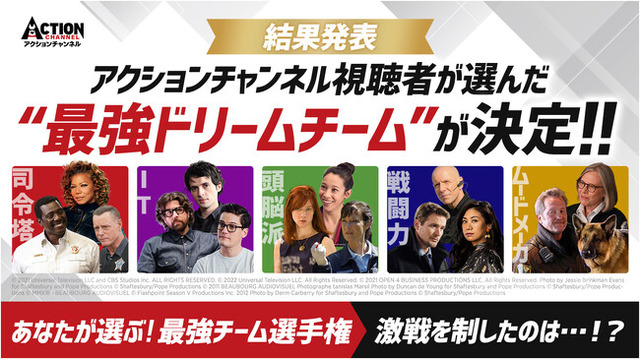 日本唯一の(*)アクション海外ドラマ専門チャンネル「アクションチャンネル」(AXN株式会社、本社:東京都渋谷区、代表取締役社長 大園天樹)は、10月・11月の「2ヵ月連続!最強チーム・アクション特集」を記念し、視聴者参加型投票企画「あなたが選ぶ!最強チーム選手権」を実施。この度、各部門における“最強”の称号を手にしたキャラクターがついに決定しました。