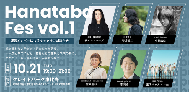 「Hanataba Fes」は映画『花束』を制作したサヘル・ローズ、岩井俊二、そして認定NPO法人Learning for All 李炯植が様々なジャンルで活躍するゲストをお招きして、多様な視点から子ども・若者を取り巻く社会課題の現状を見つめ、私たち一人ひとりに出来る事を考える連続イベントです。