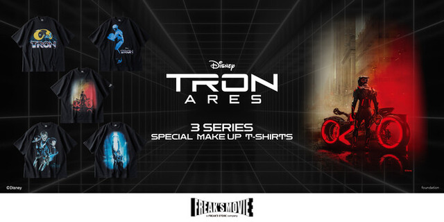 本作の公開を記念し、「FREAK'S STORE」など様々な事業を手掛ける株式会社デイトナ・インターナショナルの映画配給/宣伝レーベル「FREAK'S MOVIE」がスペシャルデザインTシャツを製作。アイテムは『トロン』よりライトサイクルやトロンをプリントしたデザイン2型、『トロン:レガシー』よりサム・フリン、クオラ、リンズラー、クルー2.0などがプリントされたデザイン2型、そして最新作『トロン:アレス』より映画キービジュアルが大きくプリントされたデザインの全5型がラインアップ!