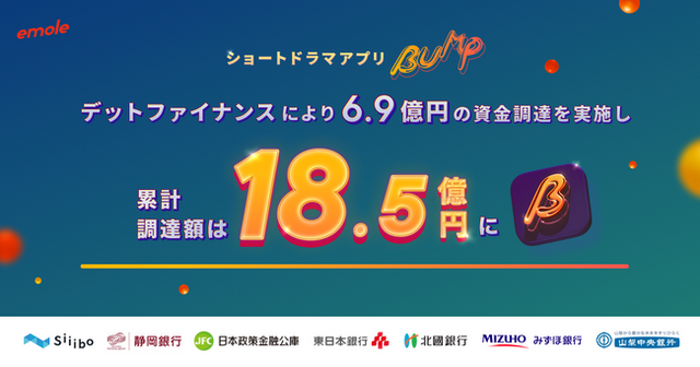 ショートドラマアプリ「BUMP」を運営するemole株式会社(本社:東京都目黒区、代表取締役:澤村直道、以下、当社)は、この度、静岡銀行など7社からデットファイナンスによる6.9億円の資金調達を実施いたしました。これにより、2024年2月に実施したシリーズAラウンドの資金調達を含めた累計調達額は、18.5億円となります。