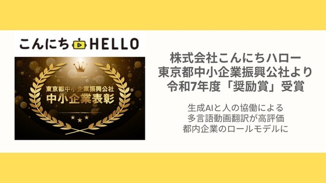 株式会社こんにちハロー(本社:東京都中央区、代表取締役CEO:早見 星吾)は、東京都中小企業振興公社が実施する「令和7年度中小企業表彰」において、「奨励賞」を受賞しました。