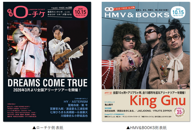 『月刊ローチケ』の表紙を飾るのは、来年、9年ぶりのオリジナルアルバムのリリースと全国アリーナツアーの開催が決定した「DREAMS COME TRUE」。そして『月刊HMV&BOOKS』には、バンド史上最多都市を巡る『King Gnu CEN+RAL Tour 2026』を開催する「King Gnu」が登場!