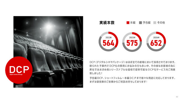 今後も、DCPの高品質・迅速な対応に加え、量産対応、字幕対応や音声仕様への対応など多様なニーズに応える体制を強化し、「映像作品が安心して上映される環境づくり」に貢献してまいります。