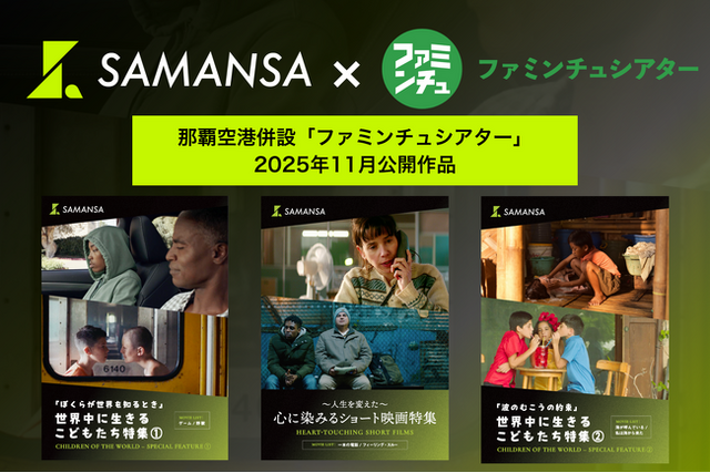 株式会社SAMANSA(本社:東京都渋谷区、代表取締役社長:岩永 祐一、共同代表:遠山 孝行)は、有限会社チャオジャパントレーディング(本社:沖縄県那覇市、代表取締役社長:洲鎌 一馬)が那覇空港で展開する「ファミンチュシアター」において11月1日より、新たな作品を公開することをお知らせいたします。今月は『人生を変えた 心に染みるショート映画特集』『「ぼくらが世界を知るとき」-世界中に生きるこどもたち特集1.』 『3.「波のむこうの約束」-世界中に生きるこどもたち特集2.』の3パッケージを公開。今月より1パッケージを60分から30分に変更し、気軽に観られる文化体験を提供いたします。
