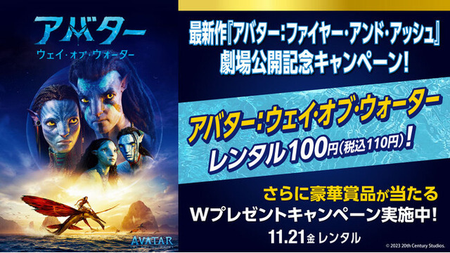 本キャンペーンでは、前作『アバター:ウェイ・オブ・ウォーター』(2022年公開・シリーズ2作目)のDVD・ブルーレイが、2025年11月21日(金)から全国のゲオショップ約1,000店舗にて税抜100円(税込110円)でレンタル(7泊8日)可能となります。さらに、最新作のムビチケカードなど、ファン必見のグッズが抽選で当たるダブルキャンペーンを同日より開催します。