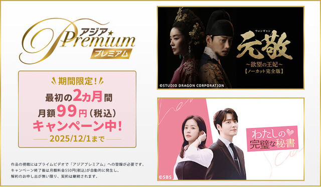 Prime Video内のサブスクリプション『ドラマ&エンタメ☆アジアPremium』(以下「アジアプレミアム」といいます)では、2025年11月14日(金)~2025年12月1日(月)の期間中、アジアプレミアムに新規または再加入でご登録いただくと、期間限定で最初の2ヵ月間 月額99円(税込)にてお試しいただけるお得なキャンペーンを実施いたします!