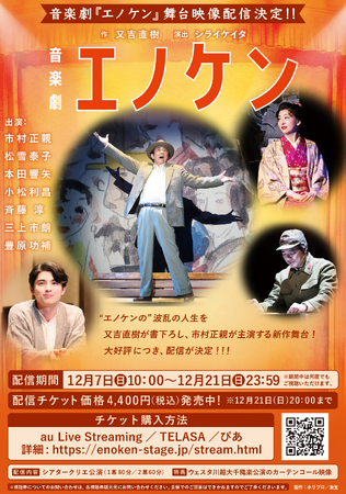 喜劇俳優 エノケンの波乱の人生を又吉直樹が新作戯曲として書下ろし、市村正親が主演する新作舞台・音楽劇『エノケン』。全国各地で満員御礼の大盛況となっている本作が、12月7日(日)~21日(日)までの期間限定で舞台本編&大千穐楽カーテンコール映像配信が決定!配信を記念して、舞台映像PVとキャスト4名・又吉直樹(作)・シライケイタ(演出)のコメントも到着。視聴券は絶賛販売中。