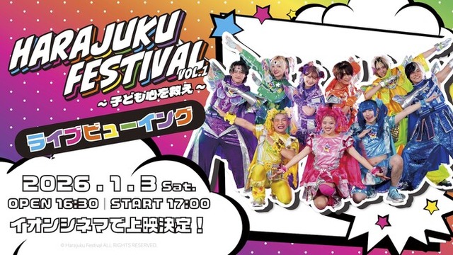 全国に「イオンシネマ」98劇場を運営するイオンエンターテイメント株式会社(本社:東京都港区、代表取締役社長 藤原信幸)は、SNSを中心に人気を集めるアーティスト<しなこ/竹下☆ぱらだいす/リアルピース>が出演する『Harajuku Festival Vol.1 ~子ども心を救え~』ツアーファイナル(会場:国立代々木競技場 第一体育館)の模様を、2026年1月3日(土)、全国のイオンシネマでライブビューイング(独占上映)することを決定いたしました。
