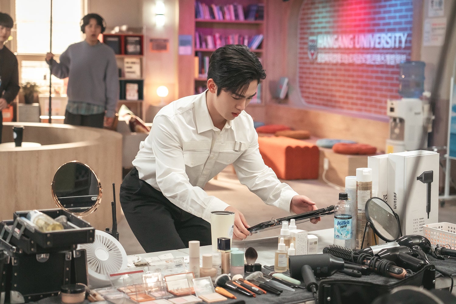 今回公開されたビハインド映像は、物語の“始まりの空気”を生々しく捉えている。冒頭、ファン・ボルムビョル演じるチュ・ヨンサンが学部長室へ走り込むも面談に間に合わず、キム・ヨハン扮するカン・ミンハクに“自分のファン”だと誤解されたせいでトラブルに巻き込まれるという、物語を象徴するシーンからスタート。現場では監督とボルムビョルが細かく動きを確認し、監督自身が実演するほど入念に作り込まれていた。