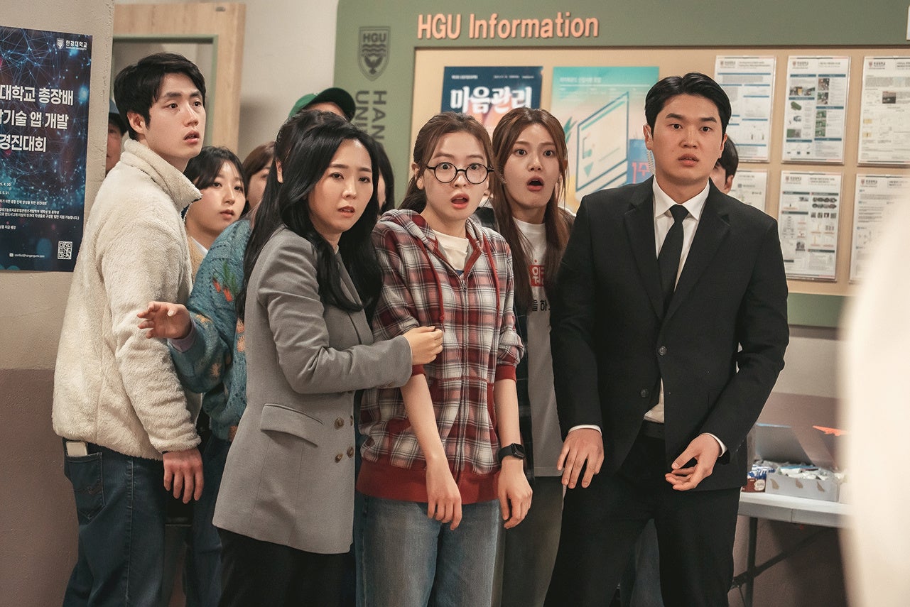 一方、ヨンサン・ドンウォン(ミンソ)・ナレ(クォン・ヨンウン)の工学科の3人組が走って走って走り続けるシーンの裏側もビハインド映像で公開された。撮影の合間には3人でセルフィーを撮り合ったり、ボルムビョルがストレッチで体をほぐしたりと、学部の空気そのままの仲の良さが滲み出る。さらに、物語上は“大事件”となるミンハクとジニーのパソコンCM撮影シーン。裏では和気あいあいとした雰囲気が漂い、ヨハンのお茶目な振る舞いにスタッフも思わず笑ってしまうほど。隅でポカンと口を開けながらじっと彼を見つめるヨンサンの表情が、この作品の“統合された学部の温度”を象徴している。