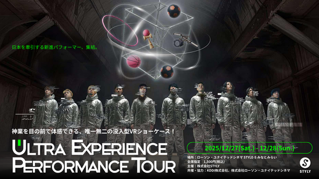 スクリーンで映画を楽しむはずの空間が、12月27日・28日の2日間、期間限定でパフォーマンスショーのライブ会場へと変身!エアダンス、フリースタイルフットボール、フリースタイルバスケットボール、けん玉、ディアボロ、フラフープなど、超人的な身体能力と圧倒的な表現力で世界を魅了するパフォーマーが集結し『ULTRA EXPERIENCE PERFORMANCE TOUR』と題した超没入型ショーケースを開催します。日本を代表するアーバンスポーツのトッププレイヤーやパフォーミングアーティストが魅せる珠玉のパフォーマンスを、VRの技術でダイナミックに、繊細に、ノンストップでお届けするという本公演。VRゴーグルをかけると音楽×パフォーマンスのスペシャルショーケースツアーがスタート!とある未来都市に迷い込んだような感覚で、一流パフォーマーたちによる圧巻のショーを特等席で体感することができます。スピード感あふれる超人技の連続で、テンションはMAXに!!劇場の最前列よりもぐぐっと近づける、超没入体験をお届けします。