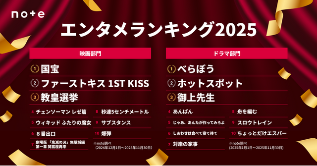 2025年にnoteで話題になった映画・ドラマのランキングを発表しました。