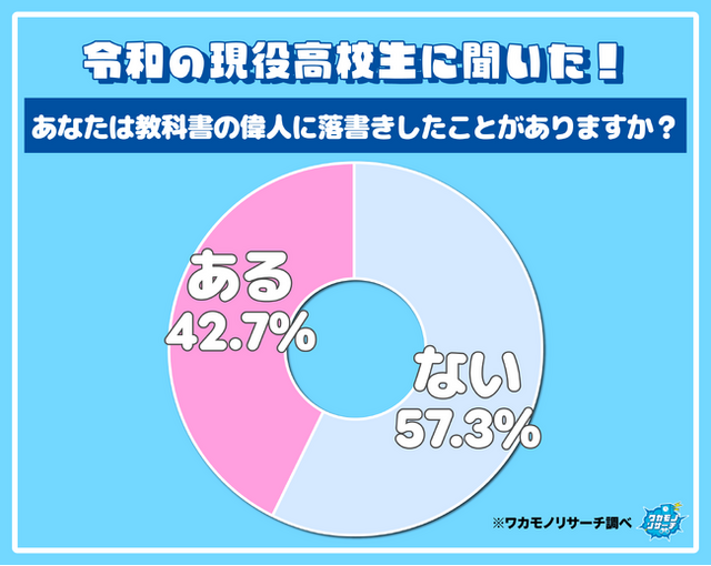 今回の調査を見ていくと、42.7%の高校生が「教科書の偉人に落書きしたことがある」と回答する結果となりました。
