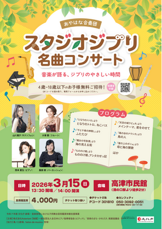 『スタジオジブリ 名曲コンサート』開催日:2026年3月15日 (日) 13:30開場/14:00開演 ※15:40終演予定