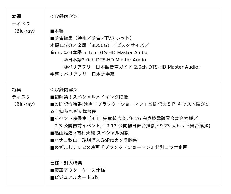 映像特典として、初解禁の貴重映像を詰め込んだスペシャルメイキング映像に加え、イベント映像や福山雅治×有村架純 スペシャル対談をはじめとした宣伝映像集や公開記念特番など、映画『ブラック・ショーマン』をより楽しめる充実のコンテンツを4時間以上にも渡り収録!