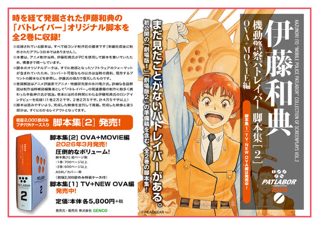 機動警察パトレイバーシリーズの脚本を手掛けるHEADGEAR伊藤和典氏の脚本集第2弾の発売が決定しました。