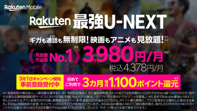 楽天モバイル株式会社(以下「楽天モバイル」)は、春の新生活を応援するため、2026年3月1日(日)より「Rakuten最強U-NEXT」に初めてお申し込み、または初めてプラン変更いただいたお客様を対象に、3カ月間 、毎月1,100ポイントの「楽天ポイント」を還元するキャンペーンを実施します(注1、2、3、4)。