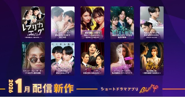 ショートドラマアプリ「BUMP」の開発・提供を行うemole株式会社(本社:東京都目黒区、代表取締役:澤村直道、以下、emole)は、「BUMP」にて、2026年1月、新作のショートドラマ作品10本、『レプリカエッグ~妻が妊娠した、誰かの子を。~』『君を王子にするまであと30日』『悪役令嬢シンデレラ 極悪女にすべてを奪われたので、最恐令嬢として復讐します』『浅はかなシンデレラたちの婚活大戦争』『君を王子にするまであと30日SEASON2 -記念日まであと30日-』『リベンジ・イン・ザ・ダーク 盲目サレ妻の逆襲(原題:Now You See Him - Revenge of a Blind Wife -)』『ここから先は幼なじみ以上です』『本当の恩人は私なのに!』『シークレット・スター 私の秘密のスクールライフ(原題:The Hidden Life of a Secret Pop Star)』『私の逆転人生 ~契約結婚で社長夫人~』を配信開始いたしました。