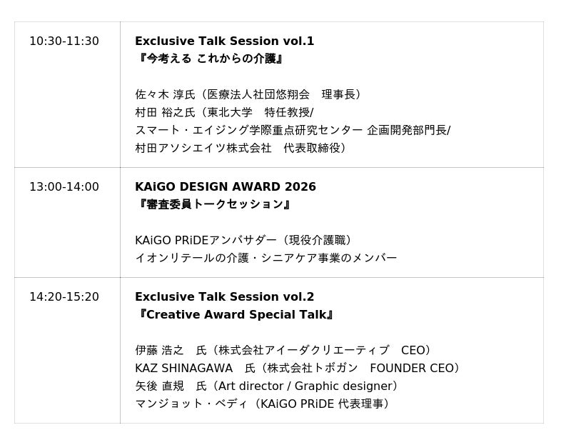 - グローバル・エイジング・インフルエンサーにも選ばれた佐々木淳氏・村田裕之氏両氏によるトークや「KAiGO x AI」をテーマに松尾研究所副社長 金剛洙氏らが語るトークなど、ここでしか聞けない価値あるトークセッション- 全国3ヵ所の地方予選を勝ち抜いたファイナリストが最終ピッチを行う「KAiGO DESIGN AWARD 2026」。会場ではプロダクトデザイン部門ファイナリストへの一般投票も実施。