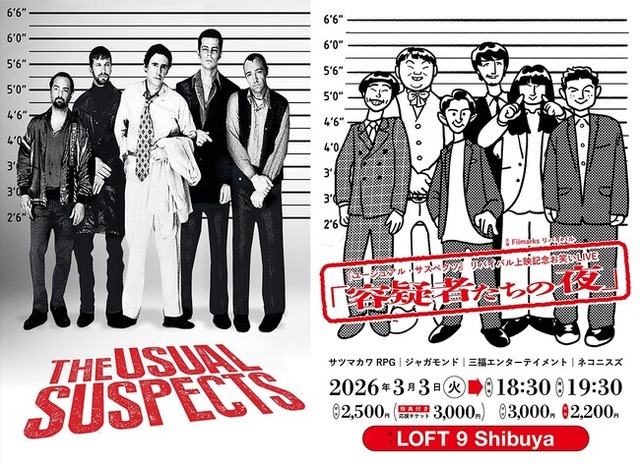 出演者は三福エンターテイメント、ネコニスズ、サツマカワRPG、ジャガモンドと、舞台やメディアで活躍中の実力派が集結。前半は『ユージュアル・サスペクツ』の空気やテーマに合わせて出演者がチョイス、または書き下ろしたネタを披露。後半は『ユージュアル・サスペクツ』の見所を伝えるプレゼントークを予定。本作のファンも、これから観るという人も楽しめるイベントとなっている。(生配信、アーカイブ配信あり。当日来場者に配信割引あり)