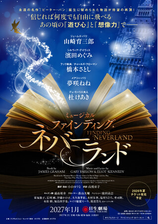 永遠の名作『ピーター・パン』誕生に秘められた物語が待望の再演!2023年に小山ゆうな演出・山崎育三郎主演で上演され大好評を得た、ミュージカル『ファインディング・ネバーランド』が27年1月に日生劇場にて待望の再演決定!さらに、濱田めぐみ、橋本さとし、夢咲ねね、杜 けあきの出演も決定。2月には宮城・大阪・愛知・福岡にてツアー公演の上演も決定している。