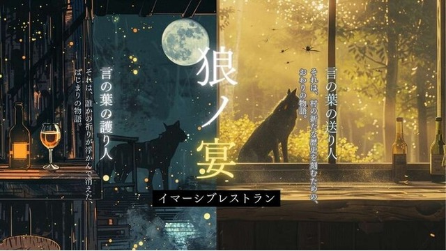 『狼ノ宴』は、昼の部と夜の部で異なる視点から同じ物語を体験する、二部構成のイマーシブ・レストラン体験です。参加者は招待客として宴に参加し、丹波山村の食材を使った料理を味わいながら、村に伝わる伝統儀式の謎を解き明かしていきます。昼と夜、それぞれ異なる立場から物語を体験することで、より深い没入感と物語の全貌を知ることができます。本企画は、2025年にリリースした『狼ノ村』の世界観を継承しつつ、レストラン体験に特化した完全オリジナルの新作として展開します。