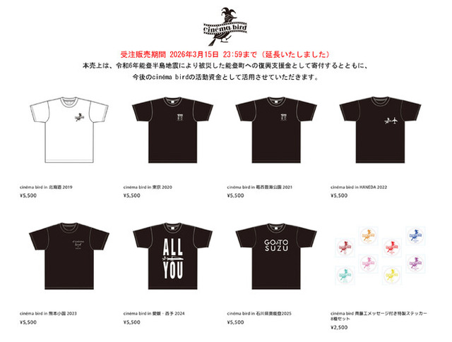 本売上は、令和6年能登半島地震により被災した石川県能登町への復興支援金として寄付するとともに、今後のcinema birdの活動資金として活用させていただきます。
