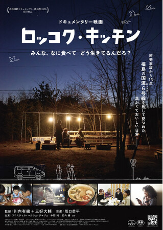 2011年3月11日に発生し、多くの人々の日常を奪い、福島の地に深い爪痕を残した東日本大震災。それから年月が経ち、福島の被災地には、帰還した住民、移住してきた人、仕事や復興のために訪れる人など、多様な背景をもつ人々が混じり合いながら新たな生活史を刻んでいる。本作『ロッコク・キッチン』は、川内有緒と三好大輔が、東京と福島を繋ぐ国道6号線(通称「ロッコク」)を車で旅し、原発被災地でツアーを企画するインド人女性のスワスティカ・ハルシュ・ジャジュさん、「おれたちの伝承館」を運営する写真家・中筋純さん、夜だけオープンする野外本屋「読書屋 息つぎ」の武内優さんの“キッチン”を軸に、その日常や人生を軽やかに描き出すドキュメンタリーである。キッチンに立つ姿、料理の手ざわり、食卓で交わされる言葉。一人暮らしのキッチンや、大勢で囲む鍋、寒い夜のスープ。どれもこの過酷な体験をした土地で育まれた「生活の色」であり、喜びや悲しみの記憶であり、希望の証である。