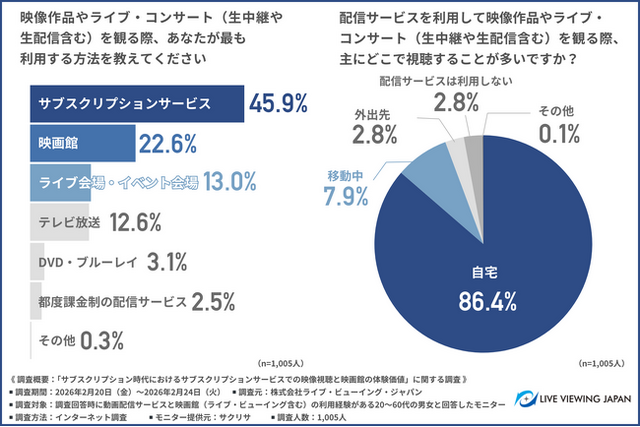 株式会社ライブ・ビューイング・ジャパン(所在地:東京都港区、代表取締役社長:青木 普起)は、動画配信サービスと映画館(ライブ・ビューイング含む)の利用経験がある20~60代の男女を対象に、「サブスクリプション時代におけるサブスクリプションサービスでの映像視聴と映画館の体験価値」に関する調査を行いました。