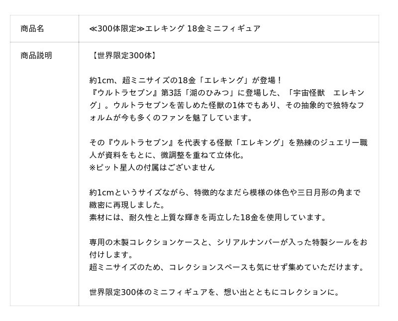 株式会社ユートレジャー(本社:東京都新宿区、代表取締役社長:青木 興一、株式会社ケイ・ウノの連結子会社)は、『ウルトラセブン』に登場した「エレキング」の18金製ミニフィギュアの予約受付を2026年3月19日(木)~4月21日(火)の期間、ユートレジャーオンラインショップ、ユートレジャーコンセプトストア池袋・心斎橋、ツブラヤストアONLINEにて行います。世界300体の数量限定です。