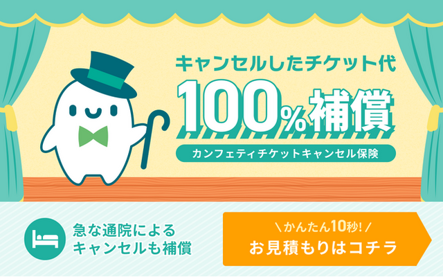 「カンフェティチケットキャンセル保険」は、チケット販売サイト「カンフェティ」の利用者向けのチケットキャンセル保険です。急な病気やけがなど、やむを得ないキャンセルの際に、購入したチケット代金を100%補償します。当キャンセル保険の申込に際して、チケット購入代金が5000円、3月24日に保険申込、4月24日に来場予定の場合、280円の保険料でご加入いただけます。