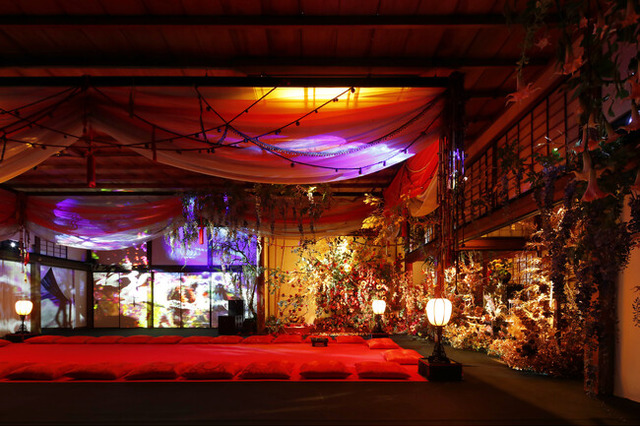 反響の声をいただいき、このたび3月29日(土)より、蜷川実花 with EiMが手掛けるイマ―シブ公演《花宵の大茶会》の美術空間を堪能できる、館内撮影可能の美術鑑賞チケットを風月殿の現地にて販売開始することをお知らせいたします。さらに4月1日からは、インスタレーションチケットで合わせて入場できる、史跡御土居の青もみじ苑が公開し、初日より夜間ライトアップを行います。御土居 梅交軒に佇む、インスタレーション《残照》は季節の移り変わりとともに新たな表情を見せます。