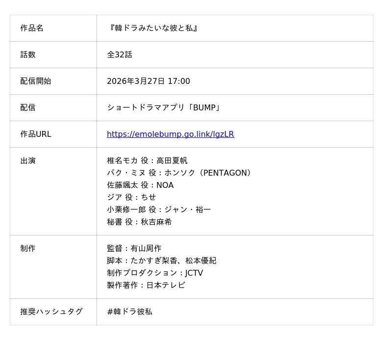 ショートドラマアプリ「BUMP」を運営するemole株式会社(本社:東京都目黒区、代表取締役:澤村直道、以下 emole/当社)は、日本テレビ製作・日韓キャストが集結した縦型ショートドラマ『韓ドラみたいな彼と私』を、3月27日(金)17時よりショートドラマアプリ「BUMP」にて独占配信いたします。