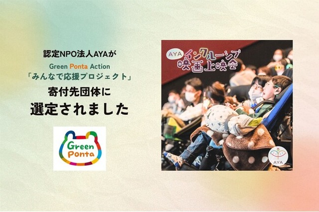 病気や障がいのある子どもたち・医療的ケア児とその家族を取り巻く「体験格差」のない社会を目指して活動する特定非営利活動法人AYA(所在地:神奈川県横浜市、代表理事:中川悠樹)は、株式会社ロイヤリティマーケティングが提供するスマートフォンアプリ「Green Ponta Action」の「みんなで応援プロジェクト」寄付先団体に選定されました。2026年4月1日(水)~6月30日(火)の期間中、どなたでも気軽に、医療的ケア児・障がい児に映画鑑賞の体験を届ける「AYAインクルーシブ映画上映会」の活動をご支援いただけます。皆さまの応援を、ぜひお願いいたします。