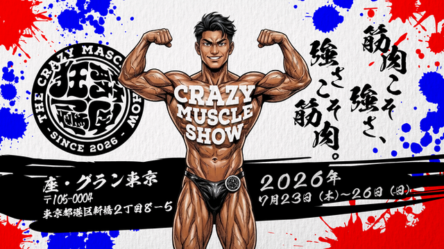クレイジーマッスルショー実行委員会(SNSグループ株式会社・株式会社まっちょホールディングス)は、実業家・堀江貴文プロデュースによるエンターテインメントショー『CRAZY MUSCLE SHOW』を、2026年7月23日(木)から2026年7月26日(日)までの4日間、座・グラン東京にて開催することをお知らせいたします。