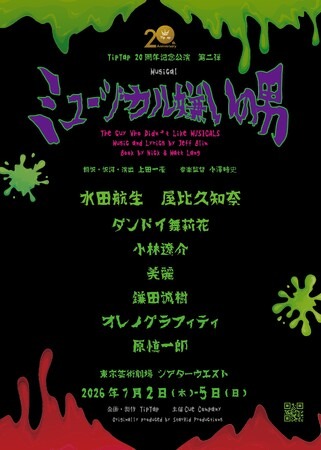 主演には『リーファー・マッドネス』で上田一豪とタッグを組んだ水田航生、ヒロインにはTipTapオリジナルミュージカル『Play a Life』で圧倒的な歌唱力を印象づけた屋比久知奈を迎えた。さらに、ダンドイ舞莉花、小林遼介、美麗、鎌田誠樹、オレノグラフィティ、原慎一郎といった多くのミュージカルや舞台で活躍する個性豊かなキャストと、上田一豪がB級ホラーコメディミュージカルの日本初演に挑みます!
