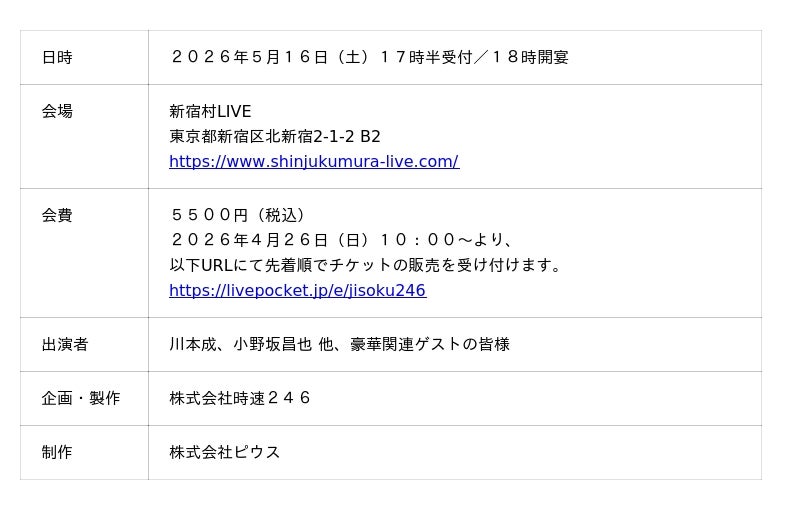 また株式会社時速246では、以下の通り、新会社設立を記念したパーティを開催いたします。小野坂昌也さんはじめ、川本と懇意にしていただいている役者さんや声優さんなど豪華ゲスト陣も駆けつけてくださる予定です。メディアの皆様におかれましては、パーティ会場でのご取材撮影も承っておりますので、ぜひご検討ください。