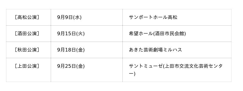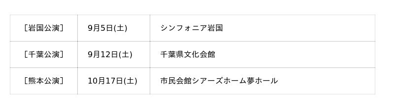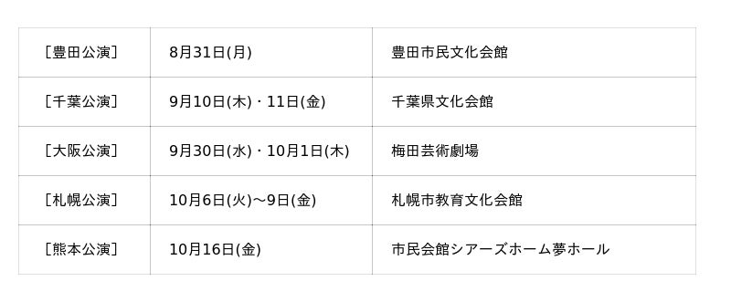音楽劇『アヤとピノッキオの冒険』は日生劇場での公演のほか、岩国(山口)、千葉、熊本でも公演を行います。[表1: https://prtimes.jp/data/corp/72555/table/15_1_44698ec5b5b3fac52ea3f1de76a55252.jpg?v=202604141247 ]