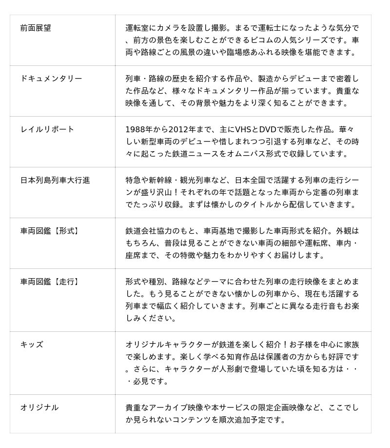 ・「前面展望」「鉄道ドキュメンタリー」「車両紹介や走行映像」「お子様向け」など、120以上の