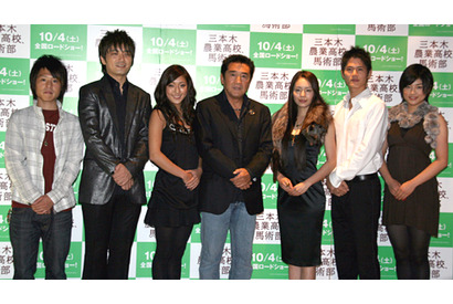 青森県に実在する三本木農業高校を舞台に、盲目の馬と一緒に馬術大会に挑戦する女子高生とその仲間たちの成長と青春を描いた『三本木農業高校、馬術部』。10月4日(土)の公開を控え、9月30日(火)、本作のプレミア試写会が行われ、上映前の舞台挨拶に主演の長渕文音、西原亜希、奥村知史、森田彩華の“馬術部”メンバーと松方弘樹、そしてメインテーマ曲を手がけた押尾コータロー、主題歌を書き下ろした「STGM(ステゴマ)」の松本秀人の総勢7名が集合した。