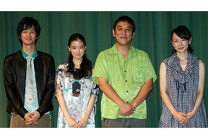 100万円を貯めるごとに職を変え、各地を転々とする一人の女性と彼女を取り巻く人々の姿を描いた『百万円と苦虫女』。7月19日(土)の公開に先立ち、本作のプレミア試写会が開催され、主演の蒼井優と森山未來、ピエール瀧(電気グルーヴ)、そして監督のタナダユキが上映前の舞台挨拶に登壇した。