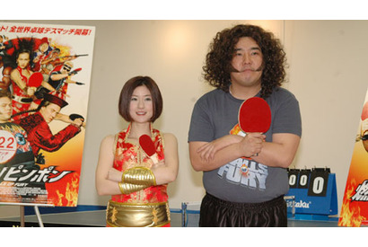 かつては卓球で“天才少年”と呼ばれていたランディ。いまは落ちぶれてかつての栄光など見る影もない彼だが、FBIの捜査協力の依頼を受けて裏の世界の卓球デスマッチに参戦することに…。ハリウッド初の卓球ムービー『燃えよ!ピンポン』が3月22日(土)に公開を迎える。これに先駆けて3月17日(月)、本作の応援団長の座を巡って、奇抜なユニフォームで話題を集める卓球プレイヤー、四元奈生美とインパルスの堤下敦による卓球対決が行われた。