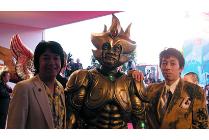 サミットを放り出して政府首脳陣が駆けつけた? 洞爺湖サミットを直前に控え、テロ対策など都内にも厳重な警備体制が敷かれる中、「サミットに便乗する形」(河崎監督)で製作され7月26日(土)より公開を迎える『ギララの逆襲/洞爺湖サミット危機一発』のワールドプレミアが7月3日(木)に開催された。上映前の舞台挨拶には、主演の加藤和樹に風刺コント集団「ザ・ニュースペーパー」の松下アキラ、福本ヒデ、渡部又兵衛、本作のエンディングテーマを手がけた「デブパレード」(ハンサム判治、COYASS、ugazin、たかぴ〜、TAH)に河崎実監督、そして体長2メートルほどの“ギララ”が登壇した。