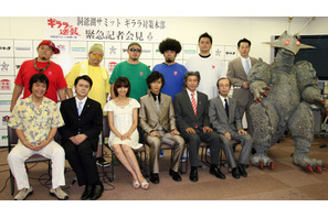 サミット開幕を直前に控え、現職&元総理大臣が集結! 1967年に製作された松竹による唯一の怪獣映画『宇宙怪獣ギララ』が41年の時を経て『ギララの逆襲/洞爺湖サミット危機一発』として復活を果たし、7月26日(土)に全国公開を迎える。洞爺湖サミットの開幕を控えた7月3日(木)、「洞爺湖サミットギララ対策本部」による緊急記者会見が行われ、主演の加藤夏希に加藤和樹、風刺コント集団「ザ・ニュースペーパー」の松下アキラ、福本ヒデ、渡部又兵衛、さらに本作のエンディングテーマを手がけた「デブパレード」、河崎実監督に本作の“主人公”ギララが出席した。