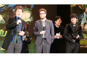 昼は新聞社の若き社長、夜は全身グリーンのスーツとマスクで正体を隠し、悪と戦う正義のヒーロー。そんな2つの顔を持つ主人公の活躍をド派手に描く3Dアクション『グリーン・ホーネット』がついに日本上陸! 主演を務めるセス・ローゲンと相棒役のジェイ・チョウ、そしてメガホンを取った奇才ミシェル・ゴンドリー監督が1月20日(木)、東京・六本木ヒルズアリーナで行われたジャパン・プレミアに華々しく登場した。