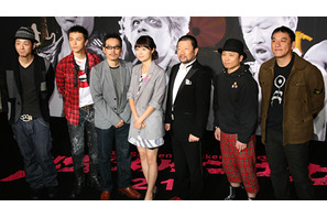 奇才・宮藤官九郎が待望の映画監督第2弾として贈る、中年オヤジパンクバンドの暴走コメディ『少年メリケンサック』。2月14日(土)の公開に向けてラストスパートをかけるべく、2日(月)、完成披露試写会と記者会見が行われ、宮藤監督はじめ、主演の宮崎あおい、木村祐一、田口トモロヲ、三宅弘城、勝地涼、ピエール瀧、そして本作の劇中曲を手がけたZAZEN BOYSの向井秀徳が登壇した。
