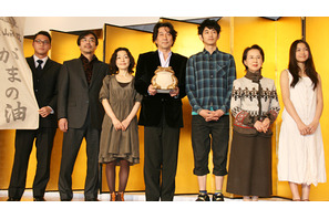 ガマの油——その昔、切り傷などに効用があるとして、祭りや縁日で油売りの巧みな話術によって売られていた、ガマ蛙の油汗を煮詰めたもの。俳優、役所広司が幼い頃に出会った油売りの思い出を基に、原案および映画初監督、そして主演を務めた『ガマの油』が6月に公開される。1月26日(月)、本作の完成発表会見が行われ、役所さんはじめ、瑛太、小林聡美、二階堂ふみ、八千草薫、澤屋敷純一、益岡徹ら共演者が出席した。