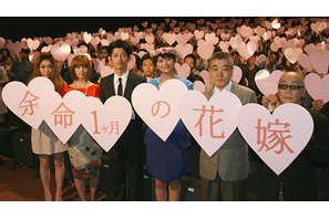 若年性乳がんと闘いながら、自らの姿と言葉を遺して、命の大切さと乳がん検診の大切さを伝えた長島千恵さんと、彼女を支えた人々の実話を映画化した『余命1ヶ月の花嫁』。早くから大きな反響を呼んでいた本作が、5月9日(土)に公開初日を迎え、廣木隆一監督はじめ、主演の恋人を演じた榮倉奈々と瑛太、柄本明、安田美沙子、そして主題歌を手がけたJUJUが上映終了後の舞台挨拶に登壇した。
